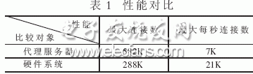 从上表可以看出在较大连接数方面,在本系统中采用一个18Mbit的CAM,它能够提供的较大地址空间为288K×144bit,只能支持288K的连接数。对于服务器的较大连接数来说,SYN和GET数据包需要经过软件协议解析。因此当较大连接数达到582K时CPU的利用率将达到90%以上[3],无法再处理新的连接。从上述分析中可以看出,由于受硬件资源的限制,硬件系统可以支持的较大连接数小于代理服务器。但是在实际的网络传输过程中,一个HTTP连接持续的时间一般为几百个毫秒,在硬件系统达到每秒21K的连接数时,能够承受的一个HTTP较大持续时间为13秒,远远大于实际HTTP连接的持续时间,因此硬件系统支持的较大连接数是够用的。当代理服务器采用千兆网卡来接收数据时,由于数据需要经过上层协议解析,因此实际能够接收的数据量只能够达到300Mbps。假设每次平均请求512B,则代理服务器能够支持的较大每秒连接数大约为7K;而当硬件系统工作在133MHz,内部采用32bit总线传输时,整个系统的带宽达到4Gbit,同时系统内部采用流水线方式,能够线速处理1Gbps数据的接收,假设平均每次请求512B,则硬件系统能够处理的每秒较大连接数达到21K,因此在单位时间内能够处理的连接数量会高于代理服务器。