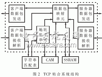 当客户数据接收端接收到GET数据包时,将该数据包发送给字符串匹配表,该表会将信息在后端服务器的位置返回给地址管理单元,地址管理单元将该信息送给数据包映射单元,映射单元将该信息写入相应的SSRAM空间中,同时通知服务器发送端与后端服务器建立连接。这样就完成了一个TCP的粘合过程。