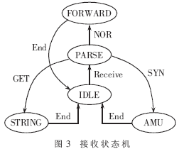 对于系统的发送接口来说,所有发送数据包的转发由数据包映射单元完成,因此发送接口仅完成简单的数据包转发功能。而当系统接收到数据包时,要对数据包进行协议解析,从而决定数据包后端处理的方式。在接收部分主要对三种数据包进行区分:(1)双方发起连接的SYN数据包。这表示一个新连接的发起,因此交给地址管理单元,为它分配一个新的地址空间,同时要求发送端返回一个ACK数据包;(2)客户端发来的GET数据包中含有客户端所需信息的URL地址,将该数据包送给字符串匹配表以获得该信息所在后端服务器的位置;(3)双方通信的普通数据包。该数据包交给数据包映射单元实现双发的通信。具体接收的状态转换图如图3所示。