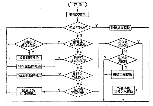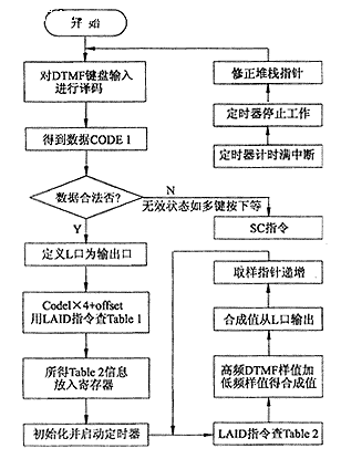 座机程序主流程如图2,手机与其类似不赘述。由于篇幅关系,不可能列出其各个模块的详 细流程。下面主要介绍其中座机DTMF模块的设计思想及程序。该模块流程图如图3。