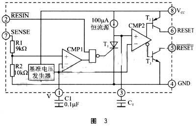 实用的静态RAM掉电保护电路如图2所示,图2中U1、U2为电压比较器,稳压管D3提供一个基准电压Vr(Vr= 3.5V)。当Vcc为5V时,在R4上得到的分压大于Vr,U2输出高电平,又因为U4输出也为高电平,故CE2输出为高电位,单片机此时可对RAM进行存取,当电源掉电时,Vcc开始下降,当满足如下条件时: