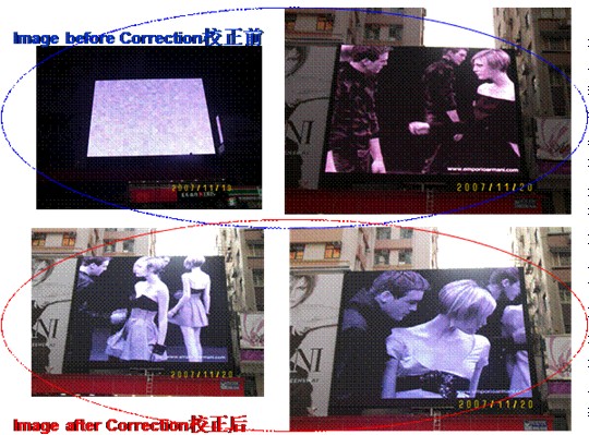 实际上由于LED发光管的衰减以及环境温度等其它因素的变化,出厂时非常优秀的显示屏性能变差的现象几乎是不可避免的。将已安装好的LED显示屏再拆卸运回工厂进行校正,在工程上是不可实现的。鉴于这些特点,显示屏制造商必须进行基于现场的校正,以保证在显示屏的整个生命周期中,始终保持出厂时的显示效果。几种现场校正方法: