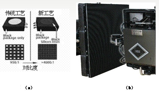 如图1所示,(a)左侧为传统工艺的LED发光管。一般为黑色面碗LED发光管,管芯为白色。(a)右侧为Barco公司采用新技术,使用黑色管芯,有效提高了对比度指标。(b)图为采用新工艺的P4间距SMD显示屏模组。