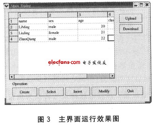 tmake-o Makefile EDBMS.pro生成Makefile,将其中的编译工具改为arm-linux-g++,加上交叉编译的相关库文件。然后make编译,生成能在ARM开发板上运行的二进制文件,并且通过NFS挂载到开发板上。运行./EDBMS,会出现我们设计的窗口界面。查询一个数据表的内容并显示在QTable控件上,主界面效果如图3所示。