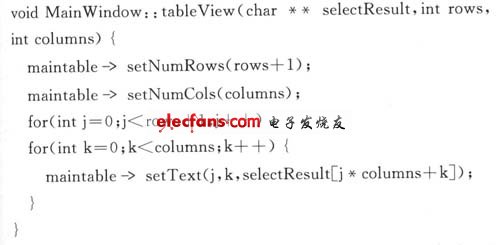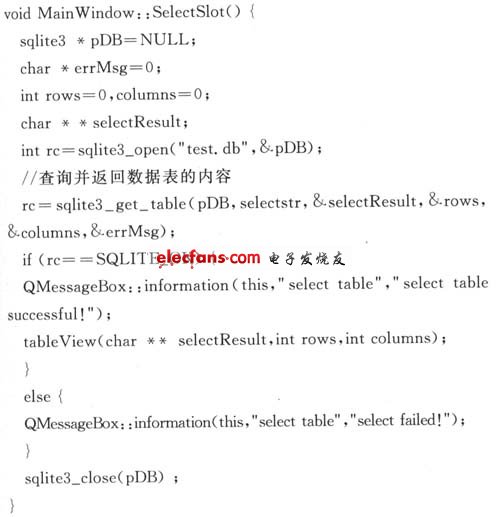 通过Qt的QTable控件来实现数据表单的显示,通过QListView、QC20mBobox以及QTextEdit等控件进行数据表单的选择、数据输入等,配合PushButton控件实现数据表的创建、删除和数据查询、添加、删除、修改等操作。这样,实现数据库系统的基本管理,并可利用串口实现与后台数据库之间的数据交互。本系统利用Qt Designer实现数据库界面的快速开发,并通过调用SQLite的API接口函数实现数据库的基本操作。下面简要介绍一下用QtDesigner开发数据库界面的基本方法及关键代码。新建一个C++项目,在此基础上新建一个窗口部件,在窗口部件上添加一个Table控件作为数据表单的显示界面。另根据需要,添加PushButton控件以实现相应的操作。在窗口类下新建一个槽,命名为SelectSlot()。连接相关按钮信号,关键代码如下: