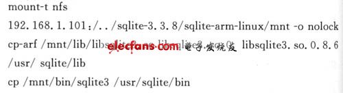 其中192.168.1.101为NFS服务器IP,这样就把SQLite库文件所在文件夹挂载到了目标板上,拷贝时注意加上-aRF选项,因为libsqlite3.so和libsqlite3.so.O是链接到Iibsqlite3.so.O.8.6的。4 嵌入式数据库系统设计及实现