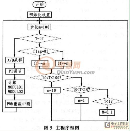 图5为主程序框图。在程序中,频率跟踪部分出现相位差时,先给频率赋一个较大步长(m=100).然后随着相位差的减小.逐渐减小步长.直到相位差为零。