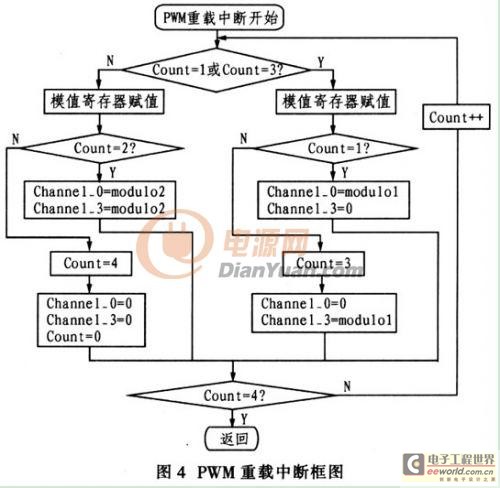 本系统的开关采用占空比为50%的PWM信号移相控制。传统移相控制方法有二种:一种是采用UC3875产生移相控制波形.但电路复杂,不便于调试。精度低:另一种是采用单片机,这种方法大部分采用正弦表产生移相波形,程序冗长、复杂、可读性差。本系统采用周期分段控制方法实现移相控制波形。在每个PWM周期中把开关管的控制波形分为4段.每段波形中DSP模值寄存器PWMCM的值等于计数器PWMVAL的值。变量Count代表输出的是第几段波形,当Count=l或Count=3时.把波形I或Ⅲ的模值MODUL01(I和Ⅲ的模值相同)赋给模值寄存器。当Count=l时,PWM模块的0通道和3通道分别输出高电平和低电平。当Count=3时.PWM模块的0通道和2通道分别输出低电平和高电平;当Count=2或Count=4时.把波形Ⅱ或IV的模值MODULO 2(Ⅱ和IV的模值相同)赋给模值寄存器.当Count=2时,PWM模块的O通道和3通道都输出高电平。当Count=4时.PWM模块的0通道和2通道都输出低电平。然后,按照上述方式循环输出波形,如图4所示程序框图。