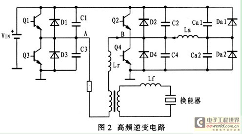 220V单相交流电经过二极管不可控整流电路得到直流电压,然后经过由MOSFET组成的高频逆变电路得到满足换能器要求的高频电压。为减少高频工作条件下MOSFET的开关损耗,高频逆变电路采用带辅助网络的全桥结构,如图2所示。此电路结构解决了传统零电压开关(ZVS)PWM电路变压器漏感小且滞后桥臂难于实现ZVS的问题。同时,根据电流增强原理,此电路结构可在任意负载和输入电压范围内实现零电压开关,大大减少了占空比丢失。超声波电源与换能器匹配的好坏将决定整个电路的控制效果。因此,应该对匹配网络每个参量(高频变压器匝比K,输出匹配电感Lf)进行严格的计算。匹配主要指为使发生器输出额定电功率,进行阻抗变换匹配。以及为使发生器输出较高效率进行调谐匹配。