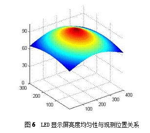 在理想状态下,观察者在不同位置观察LED显示屏,所得到不同位置所观测到的显示屏亮度均匀性数据,由这些数据构成图6所示三维分布图。通过对图6的分析,观察者在LED显示屏中心区观察时,LED显示屏的亮度均匀性较好,但中心观察区域所观测的LED显示屏亮度均匀性要远低于由《LED显示屏测试方法》所测得的LED显示屏的亮度均匀性。在边缘位置观察LED显示屏,亮度均匀性较差。观察位置与中心观察区域距离越远,LED显示屏的亮度均匀性越差。