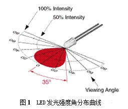 LED的发光强度随观察角度的变化而变化,从不同角度观察LED发光管,它的发光强度有很大差别。发光强度的大小由LED发光管自身的发光强度角分布曲线决定,其分布曲线如图1所示。LED光轴方向相对发光强度(即发光强度与较大发光强度的之比)为1,即发光强度较大。离开光轴方向的角度越大,相对发光强度越小。由图1可以估算出该LED的半值角,视角值为。