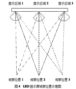 LED显示屏在实际使用中,观察者会在一定范围内对显示屏进行观察。以图4为例,假设观察者在观察位置1、观察位置2、观察位置3对LED显示屏进行观察,观察者在观察位置1、观察位置2、观察位置3的视轴与图2所示的显示区域1、显示区域2、显示区域3的光轴重合。