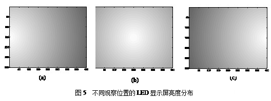 在一定的观察范围内,LED显示屏的相邻区域的亮度变化大小是由发光强度角分布曲线的斜率决定的。发光强度角分布曲线的曲率大,相邻区域的LED亮度变化越大;发光强度角分布曲线的曲率小,相邻区域的LED亮度变化越小。亮度以观察位置在显示屏上的投影为圆心,呈同心圆分布,圆心处较亮,亮度随半径的增加而减小,亮度变化与发光强度角分布曲线的曲率有关。