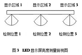 《LED显示屏测试方法》所规定的亮度均匀性的测量只是针对LED发光管的光轴方向的亮度测量。图2为LED显示屏的亮度测量的正视图,为方便起见,只对LED显示屏图三个区域进行分析。显示区域1、显示区域2、显示区域3的位置参见图2。显示区域1、显示区域2、显示区域3的发光强度角分布曲线及检测位置1、检测位置2、检测位置3如图3所示。根据《LED显示屏测试方法》对的三个显示区域进行亮度测量,检测位置1、检测位置2、检测位置3分别位于显示区域1、显示区域2、显示区域3的光轴方向。所测量的亮度值是各个区域较大的亮度值。本文假定三个显示区域的发光强度角分布曲线相同,因此得到LED显示屏三个显示区域的发光强度相同, LED显示屏的亮度均匀性达到国家C级标准。