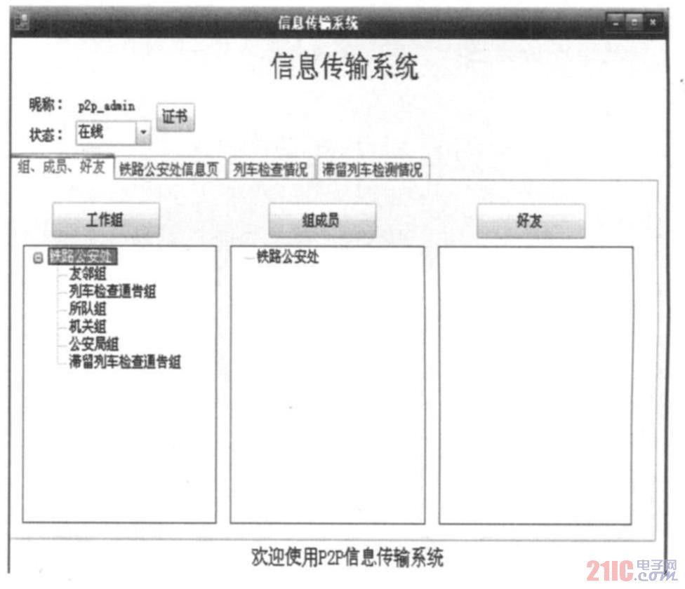 铁路公安机关的JXTA-P2P信息传输系统由四个子系统组成,即时通讯系统、文件加密传输系统、文件共享系统和协同工作系统(见图4)。