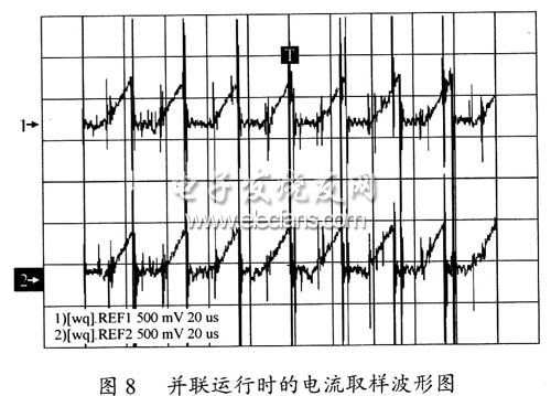 图8为充电器工作在非限流状态时,两充电器模块控制器电流取样端的电压波形图,即图2中取样电阻R1两端的电压波形图。此时从图8中可以看出,两充电器模块电流取样均为0.6V,说明并联的两模块工作在均流状态。