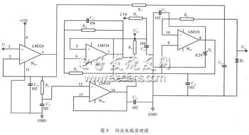 充电器并联运行时,必须有均流措施,保证负载电流平均分配,增强系统的运行可靠性。均流措施很多,有外特性下垂法、主从电源设置法、外部电路控制法、平均电流法、较大电流法等。图5为本设计所采用的平均电流法电路原理图,其基本原理是充电器系统各单元的电流值通过均流电阻送到均流母线上求平均值,然后各单元电流值与之比较,形成偏差信号去控制UC3843的脚2。在图5中R18=R21=Ra,R19=R20=Rb,运放脚7的输出为