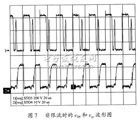 图7为充电器工作在非限流状态时,MOS场效应管S2的漏源极之问的电压VDS和驱动电压Vgs波形图,由图7中可以看出,占空比限流时有所降低,约为40%,电压尖峰没多大变化,仍约为680V。