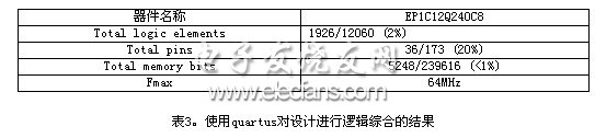 本设计采用modelsim工具进行了功能仿真,使用quartus[6]工具进行了逻辑综合,得到的综合结果如表3所示。