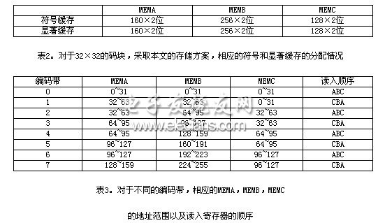 另外,从显著和符号信息缓存写数据至相应的寄存器(6×3bit)时,也要根据相应的编码带进行切换,对于奇数编码带(假设第一个编码带记为零),顺序为ABC,对于偶数的编码带,顺序为CBA(见表3)。而且,从表三可以看出,用于访问MEMA、MEMB、MEMC的地址信号的变化也不尽相同,其中访问MEMB的地址顺序增长,而MEMA的地址在从奇编码带过渡到偶编码带的过程中保持不变,从偶编码带过渡到奇编码带的过程中增长,对于MEMC的情况正好和MEMA相反。