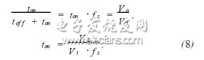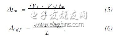 可以认为Δi就是电感线圈中的纹波电流,将导通和关断状态时的时间和电压式(2)和式(3)代入上式,分别写出导通状态和关断状态时的纹波电流表达式:
