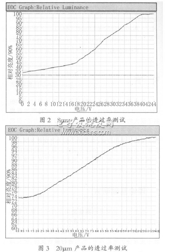 从图中可以看出,8μm 的产品只需要12V即可驱动,而20μm 的产品需要40V 才可以驱动,并且8μm 产品的开启透过率为72% ,20μm 产品的开启透过率为34%。所以在同样的制备条件下,随着膜厚的增加,透过率降低,也就是对比度在增加。从理论上分析,因PDLC 膜中聚合物网络的网眼分布均匀,其暗态的透过率降低,对比度明显增大。当然PDLC膜的驱动电压也随着膜厚的增加而升高,公式(2)也说明了这一点。