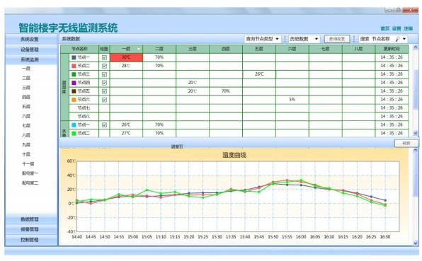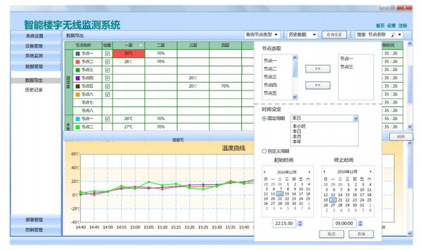3) 系统监测。查看数据及绘制图表。软件为用户提供了多种查看数据方式,查看实时显示的数据、查看历史数据。同时可在查看数据界面对收集数据进行时间、节点、类型的筛选。选择不同的节点绘制成趋势图,方便用户直观的去观测传感器数值的变化。用户可将所有数据信息和绘制的图表导出形成报表,辅助用户进一步研究和分析。