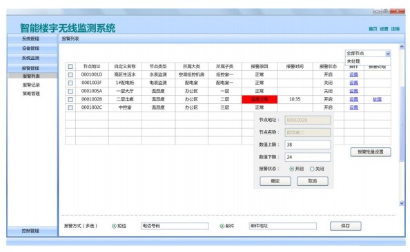 5) 报警管理。用户可对单个传感器节点或批量传感器节点或同类型传感器节点进行报警设置,用户可设置是否开启报警机制、各个节点数值限制范围及报警方式。 系统为用户提供了界面闪烁报警、手机短信报警和通过邮件报警三种模式。传感器节点数据一旦超过设定的门限值,界面就会以红色对该节点进行标识,引起使用者的注意,同时发送报警报告。