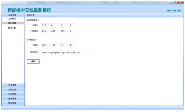 1) 系统设置。系统设置界面,用户可选择网络运行系统的工作模式,例如对网关的设置,可选择网关是否要与公网服务器进行通讯和数据上传,配置网关的的局域网 IP 地址、动态域名解析、WIFI等与网络连接有关的参数。