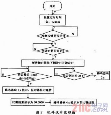 当比赛结束时蜂鸣器报警提示4 s,计时器面板计时部分显示为“00-00”,24 s显示器显示为“00”。此时本场比赛结束。流程图如图2所示。