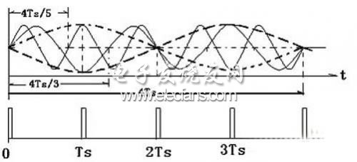 其中fs是抽样频率,当被抽样的信号频率fo是3fs/4和5fs/4时,都不满足fs>2fh的条件,是欠抽样情况。在欠抽样后都会输出一个相同频率的信号fs/4,如黑粗的虚线所示。进一步讲,如果被抽样的信号是一个以fo为中心频率的限带信号,带宽是B,且抽样频率fs>2B,那么欠抽样后将会输出一个以抽样频率fs/4为低中心频率的限带信号。当然抽样时不容许被抽样的信号中混入其他信号,即必须是一个限带信号,否则其他满足以上公式条件的信号都会进入该频带;其次根据自然抽样定理,输出的频谱中还会有与fs倍频有关的频谱分量,即输出信号频谱Xs是:
