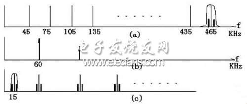 其中图4(a)表示除了465kHz的带通信号可以通过欠抽样产生15kHz的低中频信号外,其他信号也可以通过欠抽样产生15kHz低中频,因此465kHz的中频必须是一个限带滤波器输出的信号,不容许其他信号混入抽样。其次该限带中频信号与抽样信号的频域卷积除了有15kHz的信号频谱外,还有其他的频谱分量,因此抽样后,DSP要设计一个带通滤波器,滤除其他信号的频谱,如图4(c)所示。然后通过包络检波获得基带语音信号。3.1 确定抽样频率