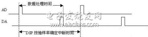 由于需要进行实时的数字信号处理,从滤波器实现到确定准确的抽样频率十分重要。具体实现的方法可以是:选择可编程AD转换器,可编程时钟发生器输入时钟到AD、DSP采用定时中断抽样等。由于本硬件设计AD是输入固定时钟,芯片不可编程,因此采用DSP中断抽样和处理的方法。根据60kHz的抽样频率,计算抽样周期是16667ns,DSP工作的时钟频率是20MHz,如果以单周期指令计算,在AD抽样的周期内,DSP可执行16667/50=333条指令。那么DSP的工作过程应该按图5时序进行。
