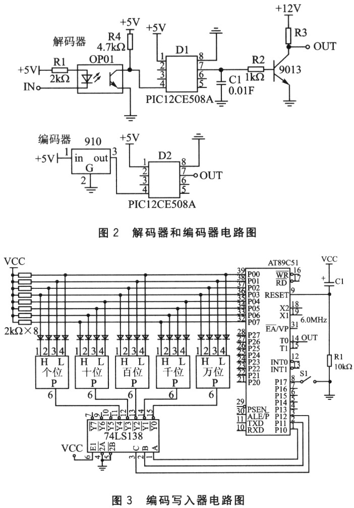 编码器的单片机通过一个I/0口来检测磁感应传感器信号,当确定为传感器产生的信号时,就通过另一个I/O口向解码器的单片机发送一组编码,而解码器的单片机则首先判断当前准备接收的数据是编码器发送的编码还是解码写入器发送的解码。当判断是解码写入器发送的解码时,解码器的单片机接收此解码,并利用 12c总线协议将解码保存到E2PROM中去;当判断是编码器发送的编码时,解码器的单片机先接收此编码,然后读出自己E2PROM中的解码,将其与接收到的编码相比较,如果相同则解码器单片机通过一个I/0口向计价装置发出计价脉冲,否则不发出计价脉冲。注意:这里每一辆出租车计价器的编码和解码都是不同的,这样有利于出租车的管理以及防止计价器的盗用,解码器中的解码是使用解码写入器写入其E2PRoM中去的。每辆出租车计价器都具有一个编码器和一个解码器,而所有的出租车计价器都共用一个解码写人器。也就是说,在计价器卖出之前,用同一个解码写入器为所有的计价器的解码器写入不同的初始解码。写入初始解码以后,计价器就不再需要解码写入器了,除非此计价器坏掉需要重新更换解码器,此时需再用解码写入器给新的解码器写入初始解码。硬件电路设计图如图2 和图3所示。