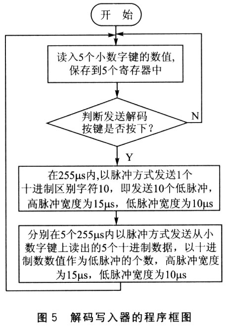 解码写入器部分使用的单片机为AT89C51,解码写入器的功能与编码器的功能类似。由于发送的解码要能随时改变,这里可以外接5个小数字键盘,解码写入器要发送的解码可以从5个小数字键盘上获得。为了和编码器发送的编码区别开来,解码写入器需要先发送一个区别字符,使解码器能够识别出当前接收的是编码器还是解码写入器发出的数据。区别字符后面紧跟着的是解码,所有这些数据的发送方式与编码器编码的发送方式完全相同,由AT89C51单片机的P3.4口输出,其程序流程图如图5所示。