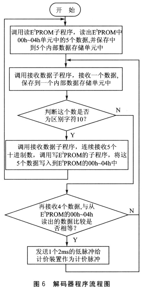 这部分采用的单片机是PIC12CE5C18,其内部有E2PROM。可以利用I2c协议随时从E2PROM中读出解码或者向E2PROM中写入新的编码。下面介绍工作过程。首先解码器读出内部E2PRoM中00h~04h中的5个十进制数据,分别保存到5个内部数据存储单元中。然后调用接收数据子程序,接收1个数据,并先保存到1个内部数据存储单元中,判断这个数据是否为区别字符10。若不是区别字符,说明现在接收的数据可能是编码器发送的编码,则继续接收后面的4个数据,并保存到4个内部数据存储单元中,将接收到的这5个十进制数据与前面解码器读出的内部E2PROM中00h~04h中的5个十进制数据进行比较,相等则在GP0引脚上发送一个2 ms的低脉冲作为计价脉冲,不相等则重新接收数据。若是区别字符10,说明现在解码写入器要修改解码器的解码,必须马上接收跟在区别字符后面的5个数据,并将这5个十进制数据保存到E2PROM的00h~04h中,覆盖以前的解码。其程序流程图如图6所示,其调用的子程序如图7和图8所示。