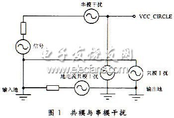 干扰信号在系统中存在2种形态,即共模与串模干扰信号。在数字系统中常用此来表征干扰作用的存在,如图1所示。串模干扰又称正态干扰,他是指串联于信号回路中的干扰,产生于传输线的互感,其与频率有关,常用滤波和改善采样频率来减少。共模干扰又称共态干扰,是干扰电压同时加到两条信号线上出现的干扰,因此线路传输结构保持平衡能很好地抑制共模干扰。另外,消除地电流,能消除共模干扰,办法是一点接地或浮空隔离(用脉冲变压器、扼流圈或光电耦合器截断地电流)。