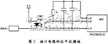 数字信号处理器以二进制码为基础。用高、低电平来表示二进制数据,并通过各种电路来描述信号特征,从而达到控制对象的目的。瞬态脉冲干扰将严重地影响了数据传输和控制状态,对于数字电路本身虽然具有很强的抗干扰能力,但在高频率电路中易受到携带高能量的脉冲干扰,其干扰部位表现在时钟发生器、总线数据传输、PWM控制信号。IPM内部的IGBT高速工作在开关状态将产生很强的开关噪声,通过地线、电源线、分布电容、分布电感的耦合带入低压数字电路中,有时严重地干扰了TMS320F240数字信号处理器的运算,表现为失控、程序跑飞和死机。