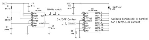 例如,TLC5917 是一款专用 LED 驱动器,其控制八个独立的恒流电流阱。正常情况下,它要求一颗微处理器,以驱动四个数字输入信号。指令/OE(允许输出)激活和关闭 IC。串行数据输入 (SDI) 数据在时钟 (CLK) 上升沿被时钟输入至 IC 的输入移位寄存器。移位寄存器中的数据在 LE 下降沿(锁闭)转入内部开/关锁存器中。当需要 LED 电流的简单 LED 开/关控制时,下列电路使用随处可见的 555 定时器,来代替微处理器控制。