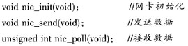 首先编写网卡的驱动程序,以完成网络通信中数掘链路层的任务,它对上层提供3个接口函数: