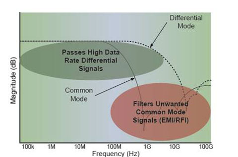 第二类EMI滤波器适用于高速串行接口,功能超过了典型低通滤波器。这类接口是具有固有噪声抑制的差分信号路径,但不会完全免疫来自外部源的共模噪声,或阻止来自辐射到系统其他部分的接口信号。