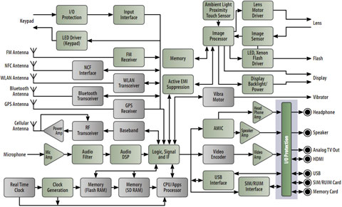 图7:智能手机框图及需要保护的I/O接口(见右下侧浅蓝色背景区域)