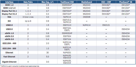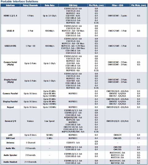表1:安森美半导体便携应用接口ESD保护及EMI滤波方案