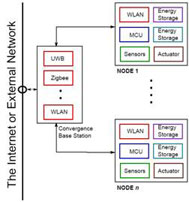 图 1 显示了一个实例网络以及每个节点的子系统。基于易于部署和更低安装成本方面的考虑,各个节点都要求能够以无线方式通信。为了降低通信开销和缩短响应时间,我们希望节点能够本地处理传感器数据,并可以控制传动器。对大量的节点进行日常维护(例如:电池更换等),其成本可能会极其的高。理想的情况是仅依靠存储/采集能源传感器便可持续工作数年时间。