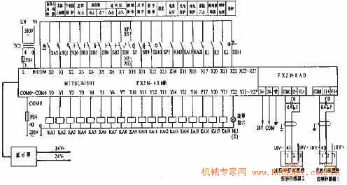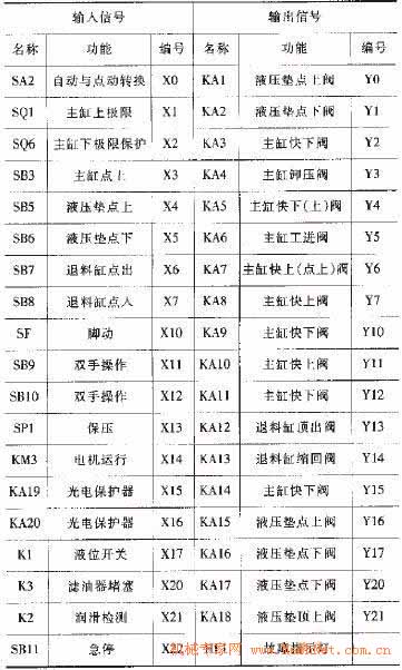 根据精密油压机运行控制技术要求,输入信号19个,输出信号19个,因此,该设备选用口本三菱公司生产的FX2N-48MR可编程序控制器。其1/O分配如表1。