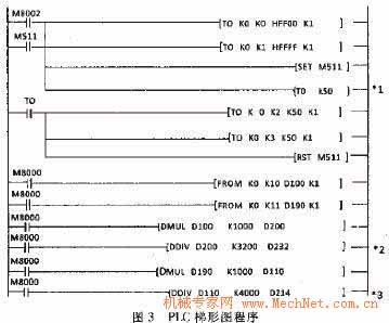 程序中主要控制各个阀的通断来控制整个油路系统,从而控制整台油压机的动作由于该部分程序较长,此处没有列出。程序还包括主缸、液压垫位置的采集,位置的采集是利用直线位移传感器,用FX2N一8AD来处理采集到的信号,通过FX2N-8AD的缓冲存储器(简称“BFM”)来完成FX2N一SAD和PLC主单元之间的数据传输。使用FROM/TO指令来读写BFM和PLC之间的数据。PLC梯形图程序如图3所。模拟量输入模块数据处理的程序如下: