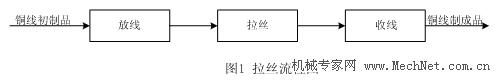 拉丝机,又名牵伸机。从产品终端来说,拉丝机可以分为大拉机、中拉机、小拉机、微拉机;从拉丝机内部控制方式和机械结构来说,又可以分为水箱式、滑轮式、直进式等主要的几种。对于不同要求,不同精度规则的产品,不同的金属物料,可选择不同规格的拉丝机械。对电线电缆生产企业,双变频控制的细拉机应用比较广泛,相对而言,其要求的控制性能也较低,而对大部分钢丝生产企业,针对材料特性,其精度要求和拉拔稳定度高,因此使用直进式拉丝机较多。尽管拉丝工艺不同,但其工作过程基本相同(如下图):