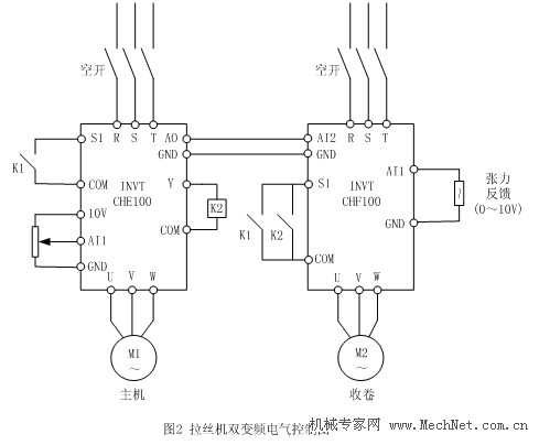 系统为塔轮式水箱拉丝机。塔轮式水箱拉丝机,通过塔轮的速比,逐步拉伸金属丝,并允许金属丝在塔轮内打滑,因此,加工的金属丝必须韧性较好。此种拉丝机加工铜丝的场合应用较多。主机采用CHE100开环矢量变频器(CHE100-004G/5R5P-4),收卷采用CHF100高性能V/F控制变频器(CHF100-1R5G-4)。两台电机用同一个运行信号K1,并在收卷的运行信号上并联一个开关量信号K2。因为主机的减速时间较长(30s),收卷减速时间很短(0.1s),保证在有停机命令时,收卷变频器还可正常运行。其并联的运行信号K2由主机的集电极输出Y控制一个中间继电器给定。电气原理图如图2所示: