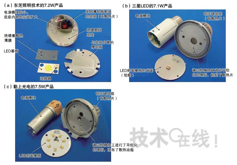 注释:东芝照明技术的7.2W产品采用发光效率较高的COB型LED。而三星LED的7.1W产品和勤上光电的7.5W产品均采用了普通的SMD型LED。较近,SMD中发光效率高的产品也不断增多,因此已经不能简单认为只有COB的发光效率出色了。部件的厂商名和部件作用为本站推测。