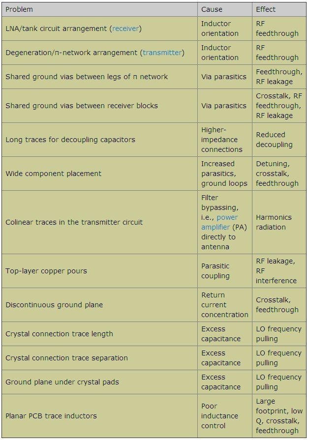 本文罗列了各种不同的设计疏忽,探讨了每种失误导致电路故障的原因,并给出了如何避免这些设计缺陷的建议。本文以FR-4电介质、厚度0.0625in的双层PCB为例,电路板底层接地。工作频率介于315MHz到915MHz之间的不同频段,Tx和Rx功率介于-120dBm至+13dBm之间。表1列出了一些可能出现的PCB布局问题、原因及其影响。